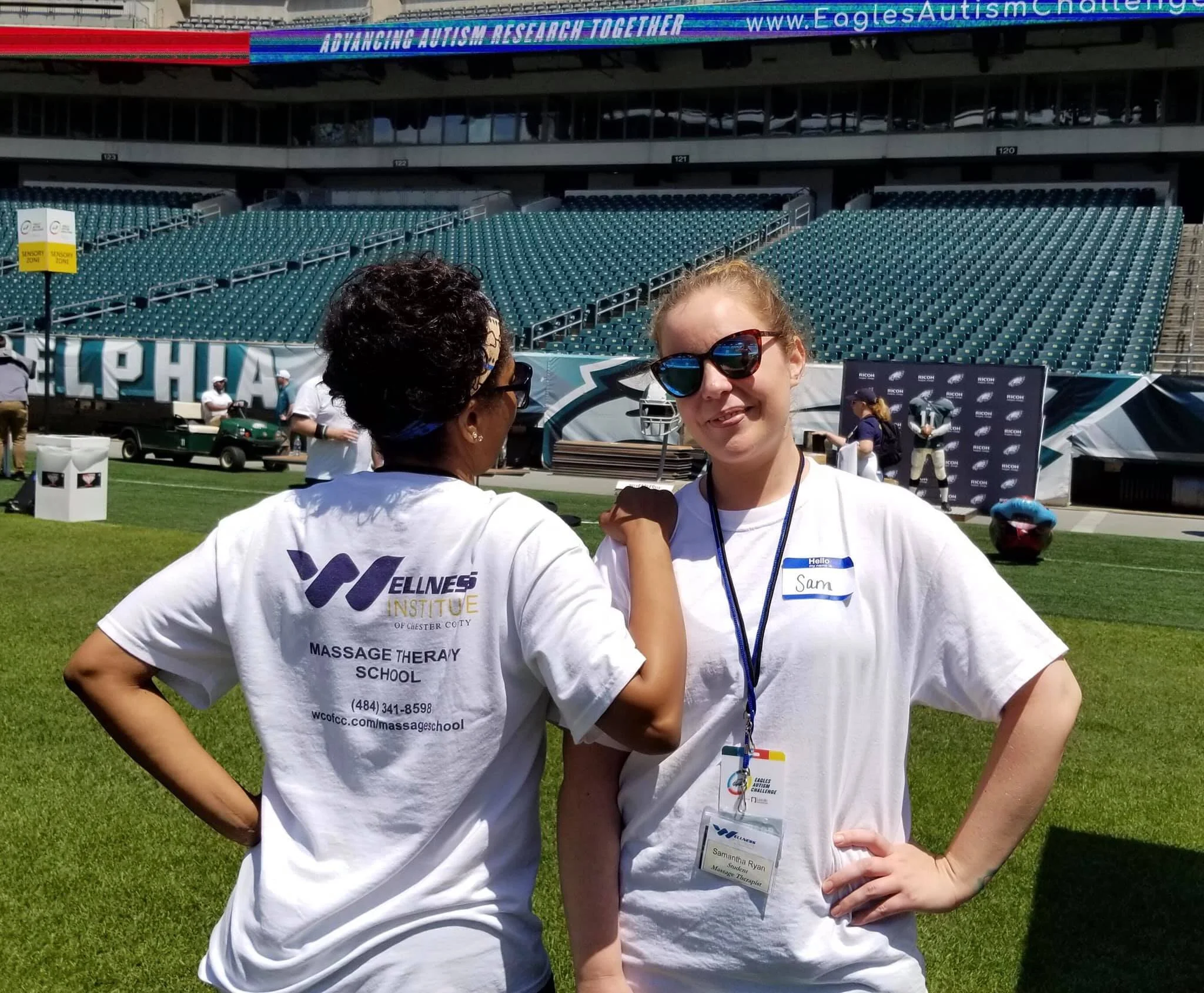 Every semester our students get the opportunity to practice Sports Massage to the entire community participating in the Eagles Autism Awareness Challenge. Our tent is right on the 50 yard line inside the Lincoln Financial Field, home of the Philadelphia Eagles. If you haven’t registered for our classes yet, click below to schedule an admissions interview and someone will reach out shortly.